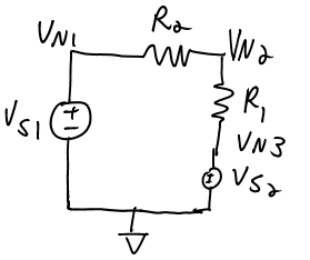 Voltage source may only exist from ground to a node. You may assume no two voltage sources are connected to the same node.